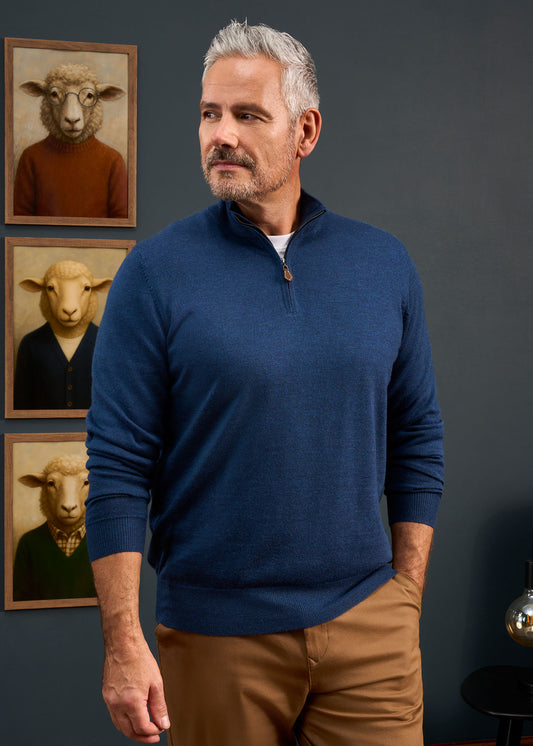 Barton Merinowolle-Mock-Pullover mit 1/4-Reißverschluss in Indigo – normale Passform