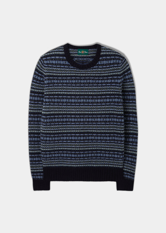Towthorpe Herren-Pullover aus Lammwolle, Fairisle-Marineblau, normale Passform