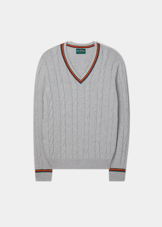Sandford Baumwoll-Kaschmir-Pullover mit Zopfmuster und V-Ausschnitt in Taubenblau
